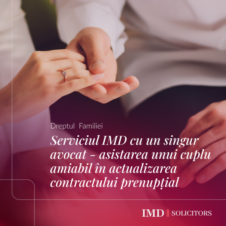 Dacă dumneavoastră și partenerul dvs. căutați o modalitate rentabilă și amiabilă de a vă modifica acordul prenupțial sau de a redacta un acord postnupțial, contactați IMD Solicitors LLP pentru a discuta dacă serviciul nostru cu un singur avocat este potrivit pentru situația dvs. Suntem specializați în asistarea familiilor internaționale și a persoanelor fizice cu active HNW în cauze complexe, transfrontaliere de dreptul familiei, cu claritate, discreție și eficiență.